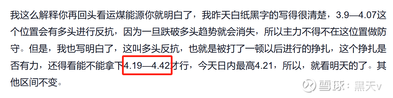 日内最高4.33,根本没有拿下我给的区间,反而收在了4.19下方,说明在这个循环里,多头依然还是属于弱势方,因为他连站稳4.19做筹码吸附都难,反而被空头轻易的打出防守区间。所以这票后续估计还会在我给的区间内做多空交换,俗称震荡。