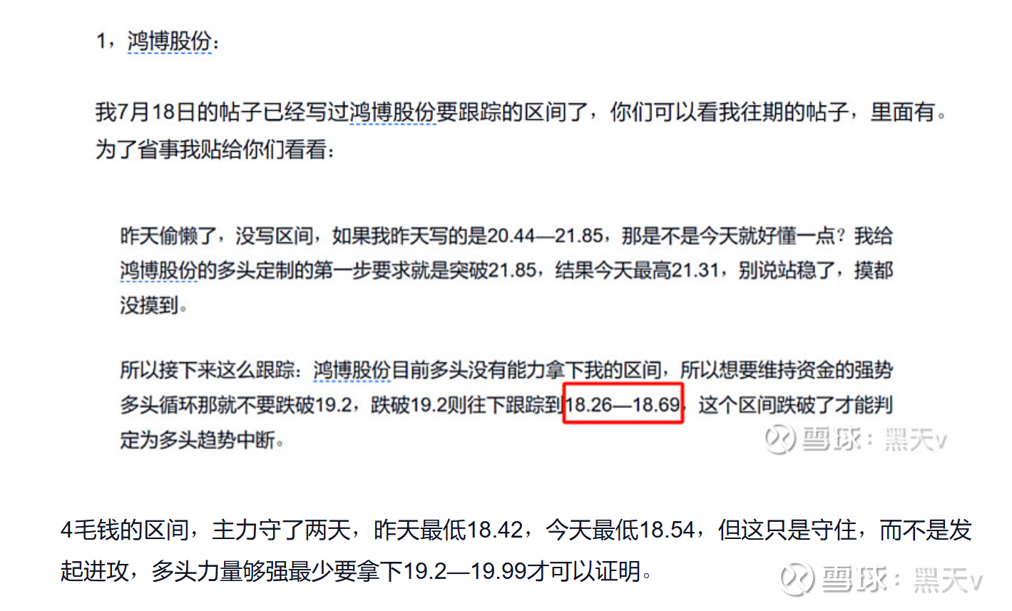 今天日内最高19.8,和云煤能源不一样,它是收在了区间内的,这意味着在这个循环中,多头是占优势的,因为空头没办法把多头从防守区赶出去,反而被多头站住了主场,所以,接下来的跟踪继续跟踪能不能突破19.99即可,能突破就继续向上跟踪。区间就用我之前写的即可。