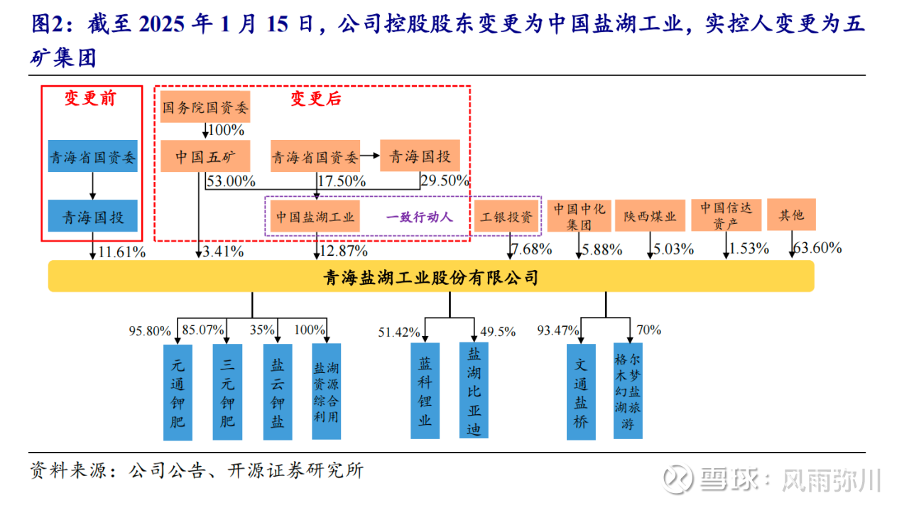 经过青海国资委主持剥离亏损业务后,2021年公司重新上市,2024年公司开始变更控股权,控股权逐步变更为五矿集团(2024 年 9 月 7 日,青海省国资委、 青海国投与中国五矿集团及下属子企业签署协议,拟共同组建中国盐湖工业,同 时中国盐湖工业拟以现金购买青海国投及其一致行动人芜湖信泽青合计持有的公 司股票。2024 年 12 月 30 日,公司公告中国盐湖工业以支付现金方式合计购买青 海国投及其一致行动人芜湖信泽青持有的公司 6.81 亿股股份,占公司总股本的 12.54%,每股转让价格 19.9007 元/股,青海国投、芜湖信泽青不再持有公司股票),并且五矿集团还在逐步扩大持股股份,2025年1月16日,五矿与工银投资签约为一致行动人,截止2025年8月6日,中国五矿及其一致行动人合计控制公司股份1,586,848,447 股,占总股本比例为 29.99%。五矿集团作为实际控制者应该能够给盐湖股份带来一些新的变化。(2024 年5月 6日,公司收到控股股东青海省国有资产投资管理有限公司(“青海国投”)的《告 知函》,青海国投拟与中国五矿集团在合力共建世界级盐湖产业基地、打造世界级 盐湖产业集团(由中国五矿控股)等方面开展战略合作)