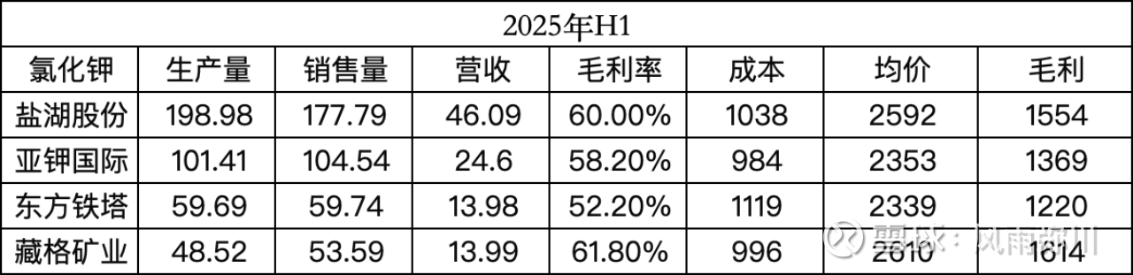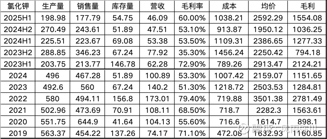 2025年中报钾产品营收53.68亿,变化不大;毛利率59.95%,同比增长6.4%。上半年销售177.79万吨,同比下降20.59%,销售均价2592.29元/吨,同比增长32.9%,单吨毛利上涨约500元。