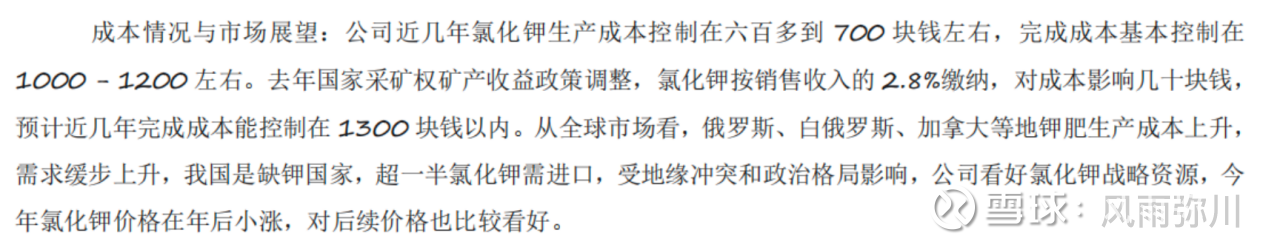 根据2025年2月份的投资者访谈记录,公司的氯化钾综合成本后期应该在1300元以内。