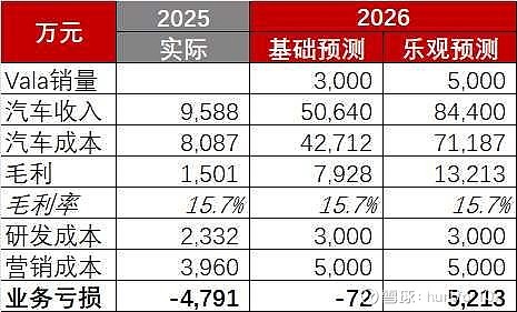 $VALA(02051)$ 业务观察202603312025年虽然汽车业务还是亏损,但是毛利率健康,主要亏在研发和营销,做了个简单的预测。没有大意外的话,汽车业务2026年可以打平如果kcar或者新车型表现不错,则汽车业务2026就有希望盈利
