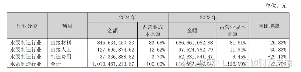 公司自研自产电机(泵成本 50–60%),不外购电机,成本比同行低 15–25% 材料集中采购 + 战略锁价 + 自动化产线,材料利用率高、损耗低。直接材料占比 83% 但可控性强 净利率27%+(同行 5–15%),显著领先,对铜、硅钢、塑料等大宗波动有强缓冲。