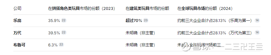 乐高、万代、布鲁可三家公司的主营业务和优势市场不同,因此份额数据需在特定细分市场中查看,情况如下: