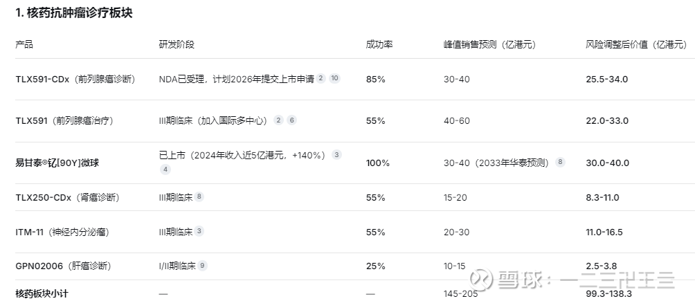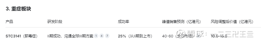 综上统计,核心管线合计(风险调整后) 146.5 - 207.2亿港元。