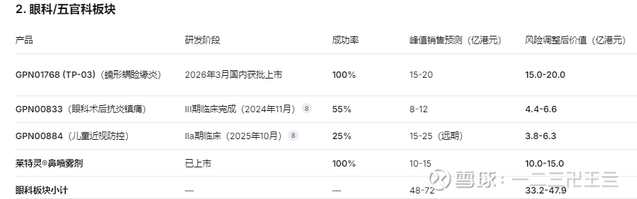 如果把各条管线的价值都按比例计算上,常规计算是根据研发阶段赋予成功率计算, 临床 I期:10-15%,临床 II期:20-30%, 临床 III期:50-60%, NDA阶段的:80-90%。