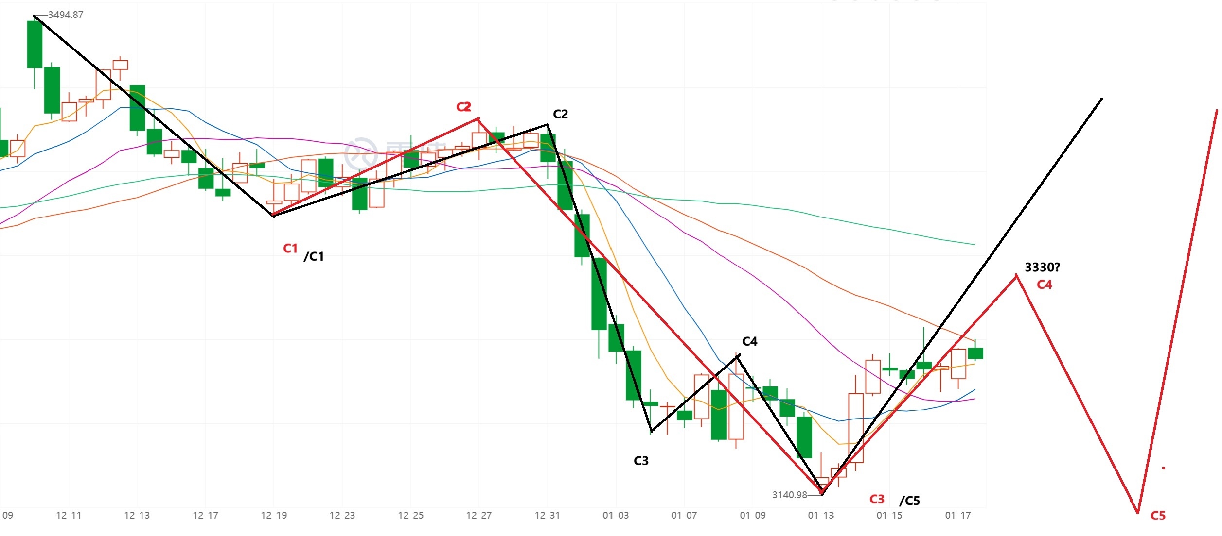 有一些让给画一下,因为他们没有太懂。如下。黑色字体是整个下跌结束。红色字体是可能还有一个C5下跌。注意后面结局一样。