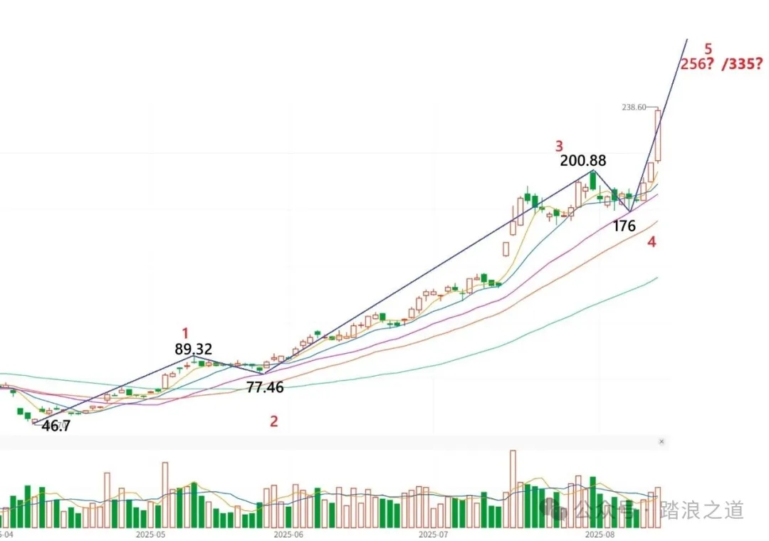 翻倍:关于新易盛,前面在“踏浪之道:新易盛20CM涨停了,下一步怎么办?”讲过它可能翻倍:“本波结束后, 基本就大概知道能否翻倍了”。当然这个翻倍是从我分析开始,当时价格89(而不是从底部起点46.7算)。今天收盘236.56,涨幅+166%。