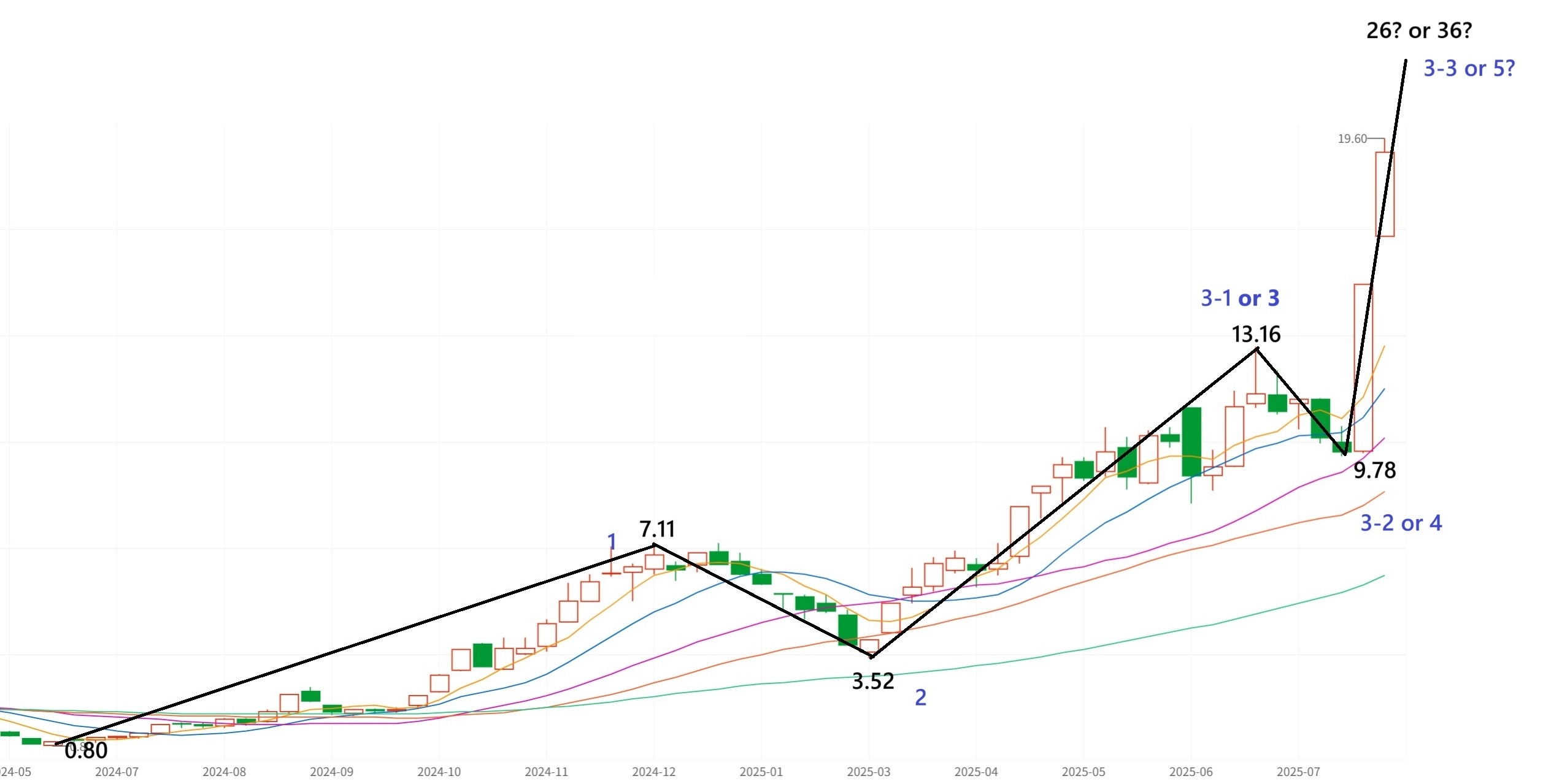 如果目前是5浪:如果目前是5浪的话, 因为3浪涨幅比1浪小, 那么5浪一定会比3浪小。假设5浪涨幅是3浪的0.618倍(2.73*0.618)。 那么5浪可能会到:26块左右。从8/5号算, 翻2.5倍,其实也不赖。