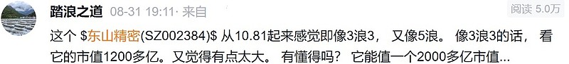 东山精密: 8/31号觉得东山精密有点从10.81(24/2/5)起来的3浪3走势。唯一嫌弃的就是感觉市值有点大。翻个倍就到2000多亿了。不过看这几天的走势,确实有点3浪3的感觉。