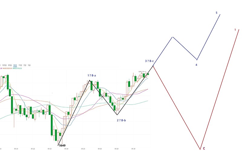 一:假设5649起来是推动上涨的话,节后应该持续3浪上涨才对(上图蓝色)。
