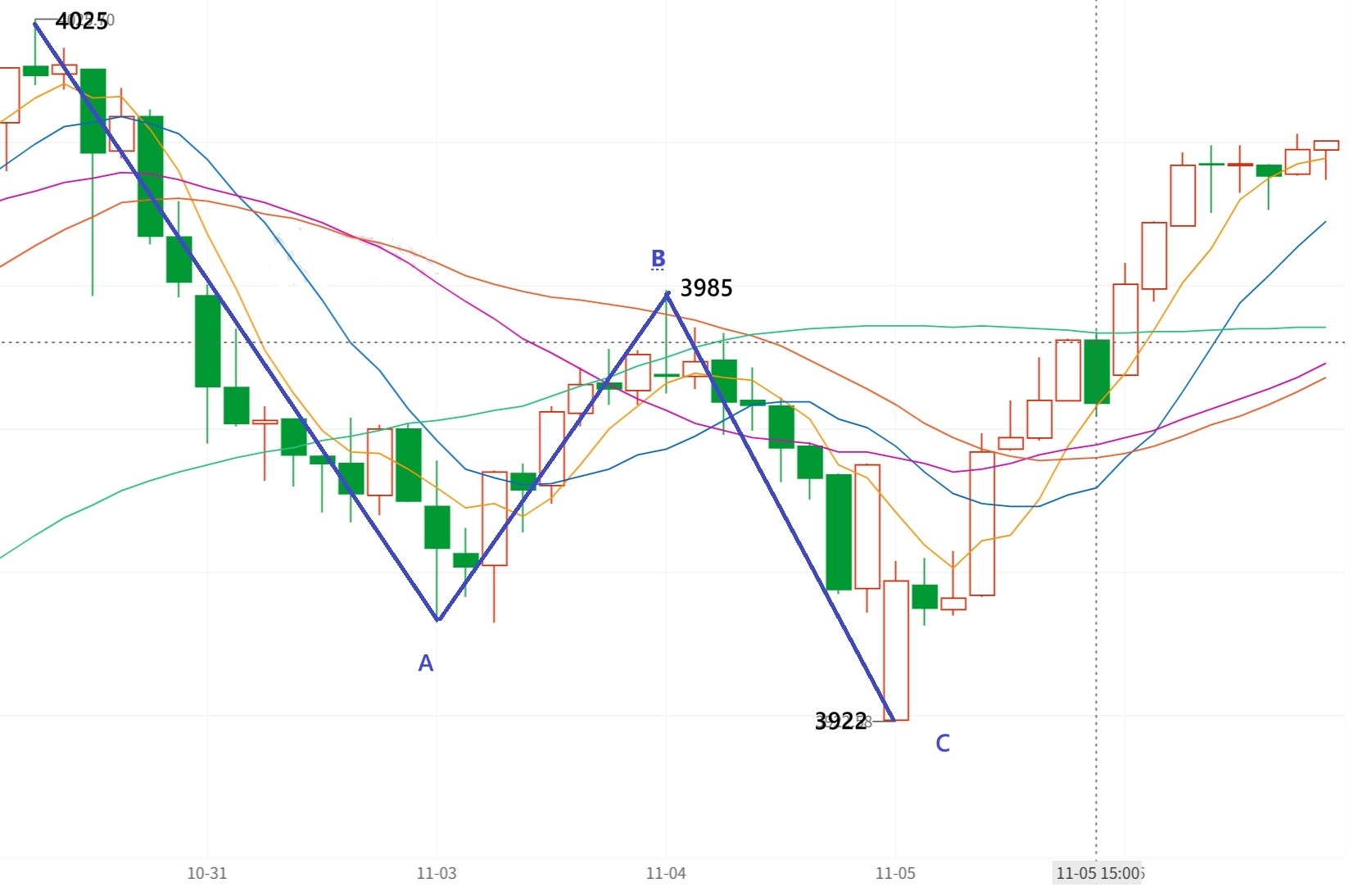 今天正好直接上涨, 那么从4025到3922就是比较明显的3个子浪结构。那么这一小段只能是ABC调整结构。 不管右面是直接新高,还是还会继续短线调整, 那么从4025下来大结构是调整就基本定型了。那么大概率4025就不是短期的顶。整体很有可能就是会走“11/01:大A指数目前最有可能的走势”中的图形。