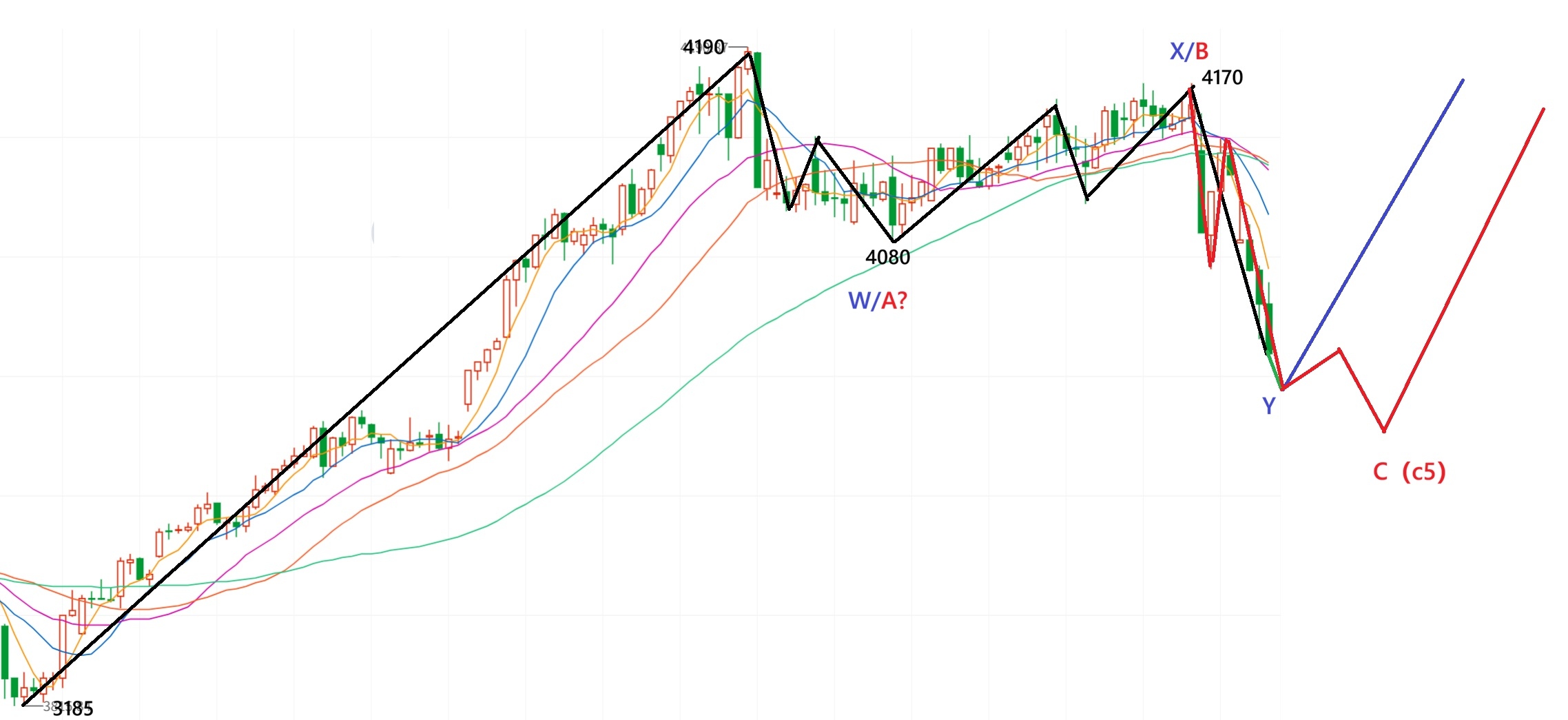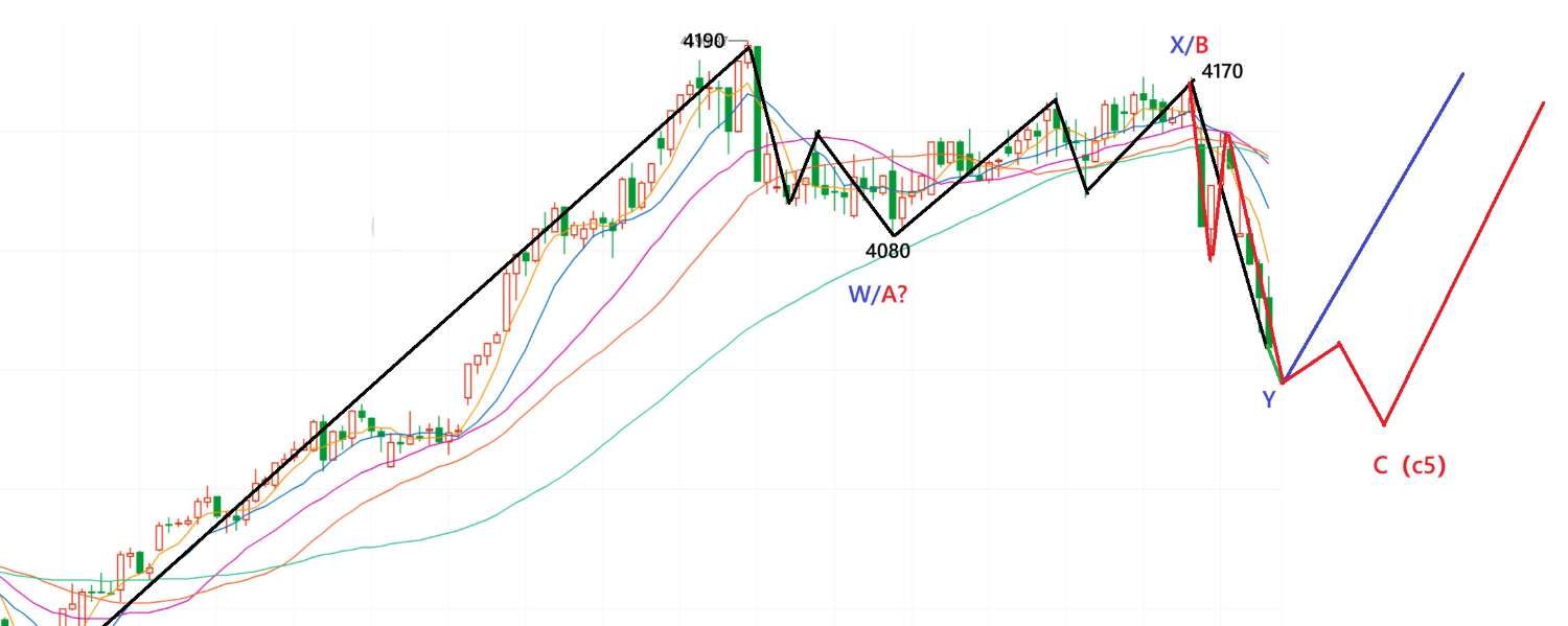 一:4190跌下来走双锯齿联合调整:如上图WXY结构。那么明天应该稍微惯性下跌,应该开始涨了。紫色标识。
