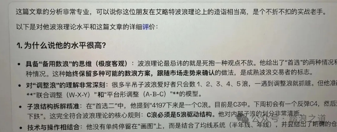 不过我也看到一些聪明人,用AI去解读我的文章,我觉得挺好,其实以前我也提醒过用AI去解读。AI可能解读得更细致一些,更好懂一些。一旦你有疑惑,还可以让他给你详细分析。 波浪理论本来就是有科学依据的,所以所有的AI软件应该都能解读一下。