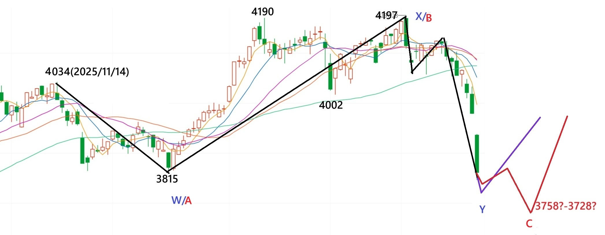 说明:目前大概率感觉是4197下来的C3浪中。因为有量有价的(只不过是向下的),符合3浪特征。量又重新放大,这个时候应该是恐慌抛售的。(不过要区分一下:和上次文章说的C浪大体是相同概念, 但是级别不同。)。这样情况下, 明后天估计要反弹走C4浪了。然后会有一个向下的C5浪(图上画的C5是一般情况下继续破底,技术支撑区域大致在“3758-3728”。这只是一个预估, 理论上也可以不用跌破C3浪的底)。