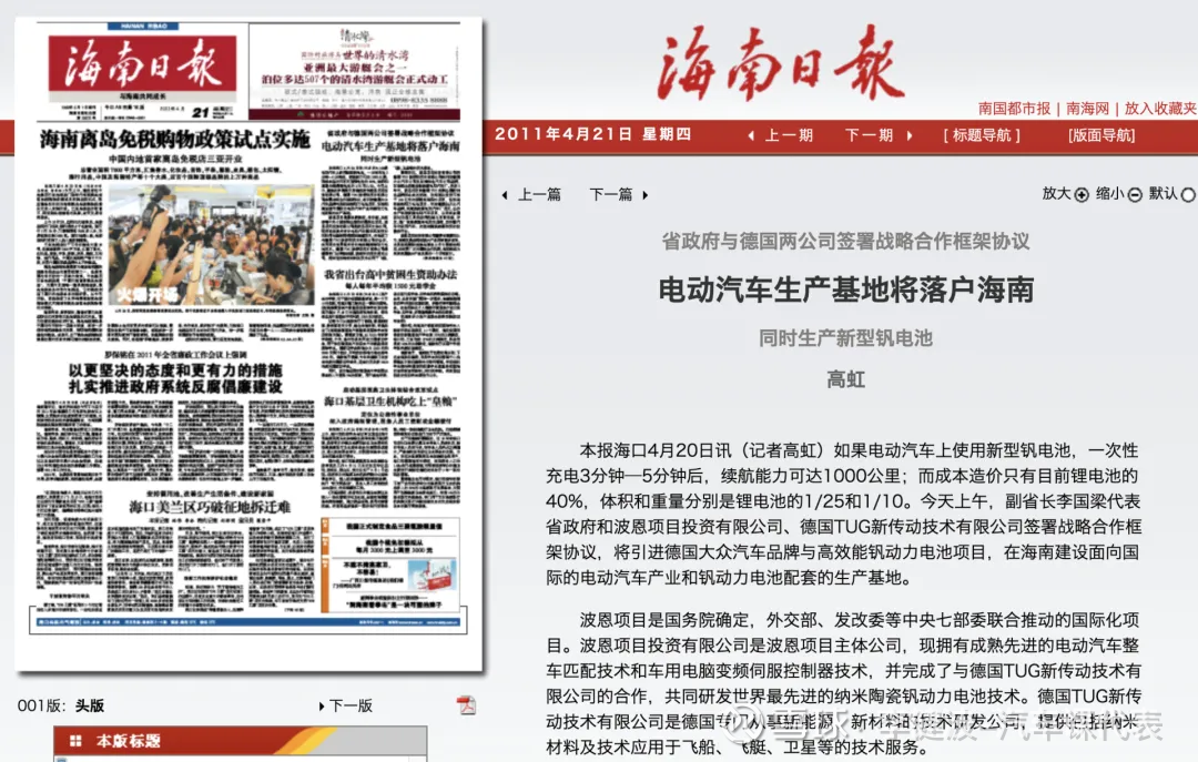 2011年钒电池:海南当地媒体报道,说海南政府要和德国公司合作,生产“充电3-5分钟能跑1000公里”的钒电池,还吹“手机用的钒电池,充3-5分钟能⽤一个半月”。后来就没下文了,跟从没提过这事儿似的。