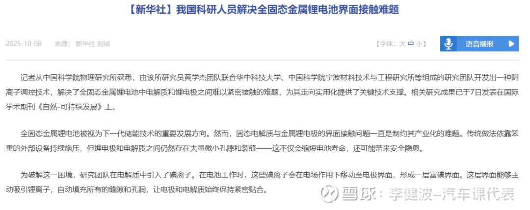 中科院黄学杰团队则在《自然-可持续发展》(NatureSustainability)上发文,说他们开发了一种“阴离子调控技术”,解决了电池里电解质和锂电极“贴不紧”的老大难问题,给全固态电池的实用化带来了希望。