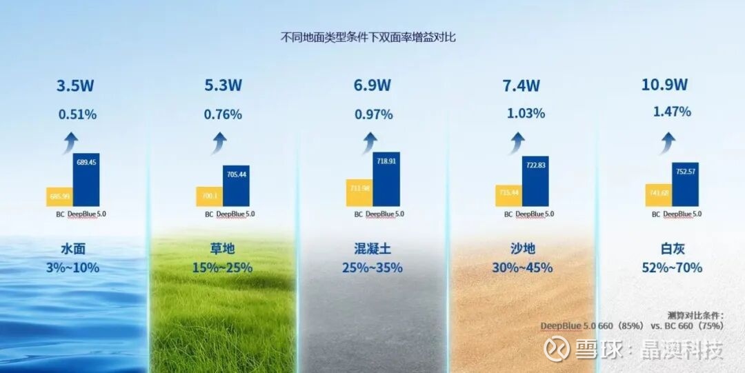 更高的双面率,解决的是背面收益问题。第三方权威咨询机构InfoLink曾预测,2025年-2028年,双面组件市占率将达到86-88%。尤其是在沙戈荒等大基地场景,正面+背面综合效率高、综合发电高、综合客户价值高的技术产品将充分发挥优势。晶澳将双面率推升至85%的水平。在白灰等高反射场景下,DeepBlue 5.0相较同功率BC组件,综合功率可提升10W以上,双面增益最高达1.4%。