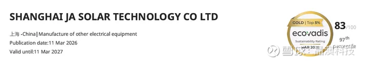 近日,全球知名可持续发展评级机构EcoVadis公布最新评估结果,上海晶澳太阳能科技有限公司(以下简称“上海晶澳”)凭借在环境、社会与治理领域的卓越表现,以83分的优异成绩,成功获评“金牌”等级,跻身EcoVadis全球参评企业的前5%,上海晶澳首次参评即夺金,标志着其在可持续发展领域的系统化建设实现了质的突破,以ESG硬核实力诠释中国光伏龙头企业的责任担当。