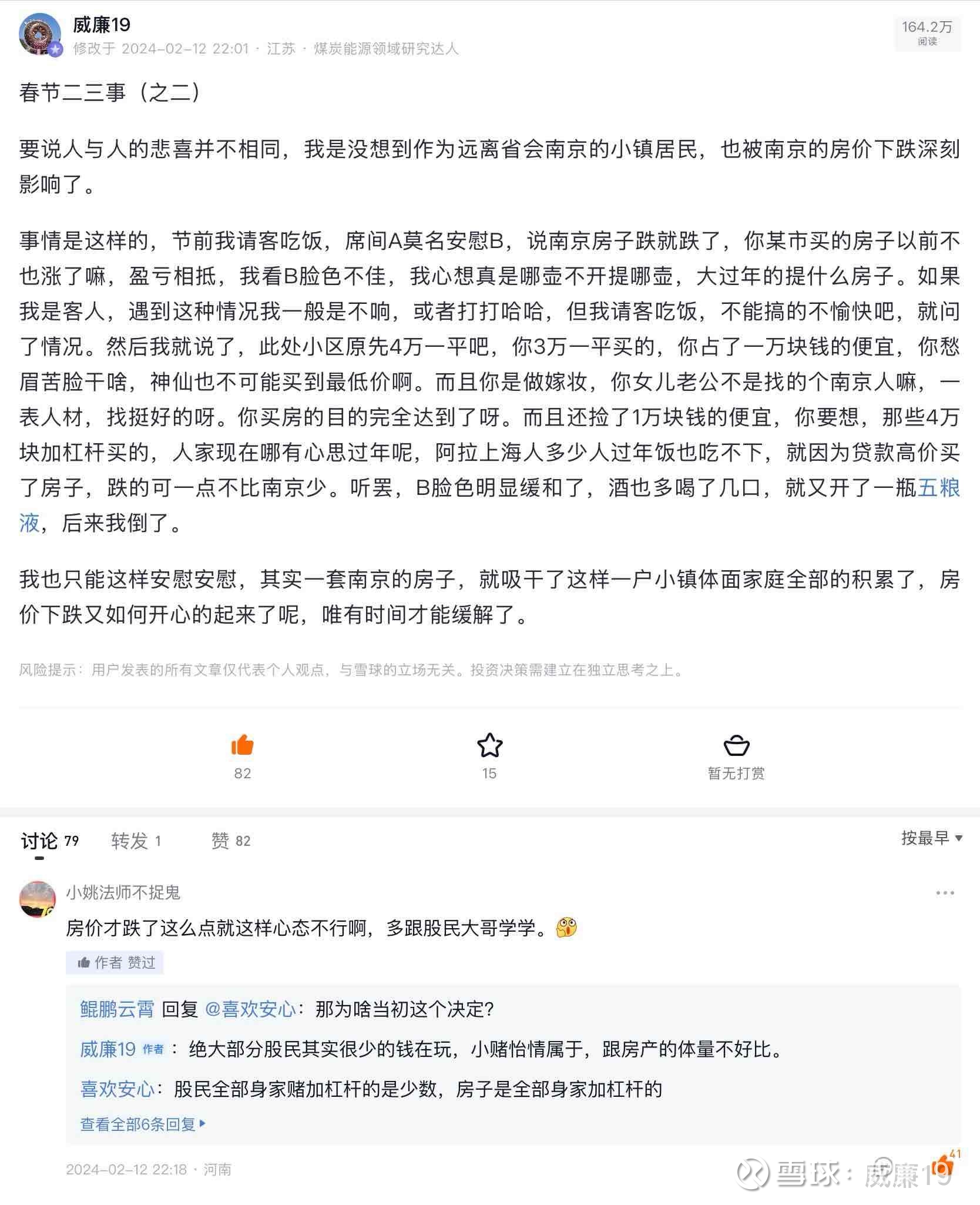 回顾下2024年春节的见闻。南京房价又跌了两年,从最高点下来平均跌幅40%,部分地段腰斩以上。以前在雪球谈房地产的帖子,流量很高,如今很少有人讨论,人性就是这样,损失厌恶,不愿意再提了。全雪球大概也只有我,在高位不断的提醒泡沫,并还在跟踪房产。