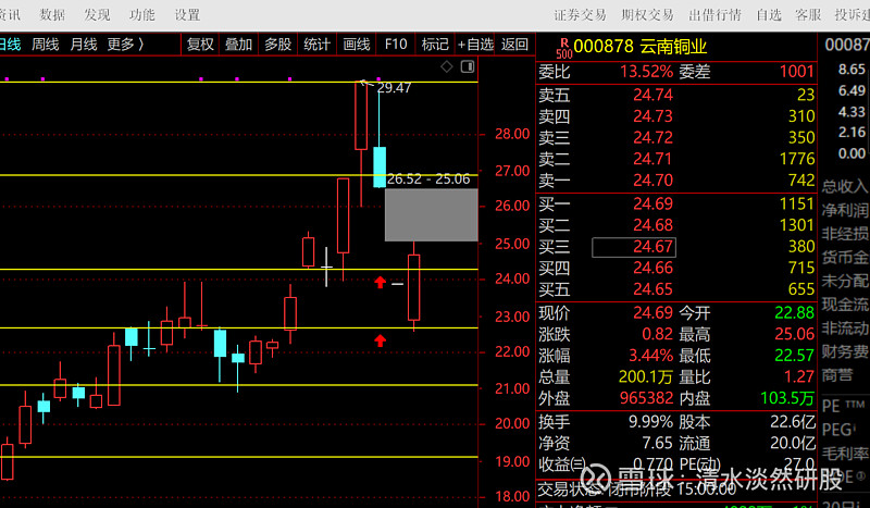 云南铜业点到即止。非常准确靠谱的,这就是技术预测,不到你不信的,包括大盘涨跌也是。云南铜业我说了要深度调整,第一指的是股价,现在跌到位了,第二就是时间,要盘整一段时间,修复技术指标,顺便洗盘震仓。然后还有至少一轮上涨的上涨,包括整个有色板块。提前预测股价的涨跌,这都是小儿科,要懂得什么是底,什么是顶部才是重要!!!买股不能买半山腰,更加不能买山顶,或者被震仓震出去吃不到主升浪!!!