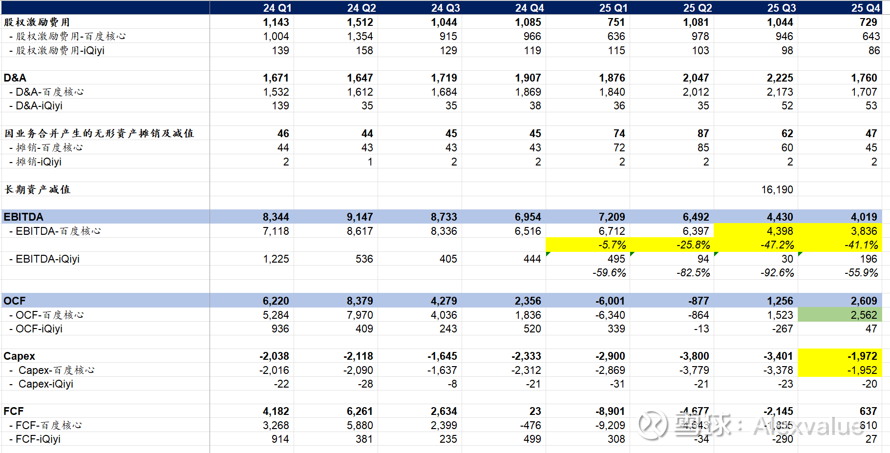 然后,比较令人意外的是,本季的Capex居然大幅下滑,仅19.52亿元,跟前几个季度每季35亿左右的支出将近减半,不知是因为更多自采昆仑芯在合并范围内没有体现还是说真的降了支出,这确实是令人感到诡异的地方;但从折旧摊销也下降的角度,似乎更支持capex真的在下降这一结论。然后本季可能唯一的亮点就是OCF以及FCF转正,当然后者转正更多也是基于capex的下降造成的。