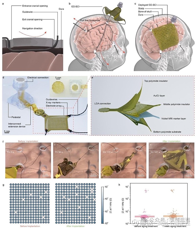 最终通过超柔性薄膜电极阵列与导丝驱动策略结合,电极折叠后通过4个毫米级颅骨孔拉入硬膜外空间,再借助超柔性导丝精准展开,全程仅需 2 小时且无需移除大块颅骨。