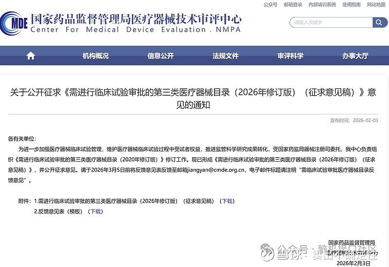 近日,国家药品监督管理局医疗器械技术审评中心(CMDE)发布公开征求《需进行临床试验审批的第三类医疗器械目录(2026年修订版)(征求意见稿)》通知。