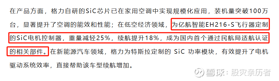 中国粉体网的报道显示,格力电器宣布已建立 SiC SBD 和 MOS 芯片的完整工艺平台,其自研的 SiC 芯片已在家用空调中实现规模化应用,在低空经济领域,为亿航智能 EH216-S 飞行器定制的 SiC 电机控制器,重量减轻 25%,续航提升 18%,成为国内首个通过民航局适航认证的相关部件。中国粉体网是一个行业内具有一定专业性和权威性的资讯平台,并非单纯的自媒体。
