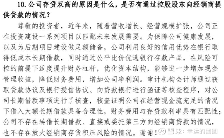 1. “大存大贷”问题,这个问题属于上市公司。我的判断是这是公司的财务动作,目的是利用公司在银行的良好信誉赚利息差。