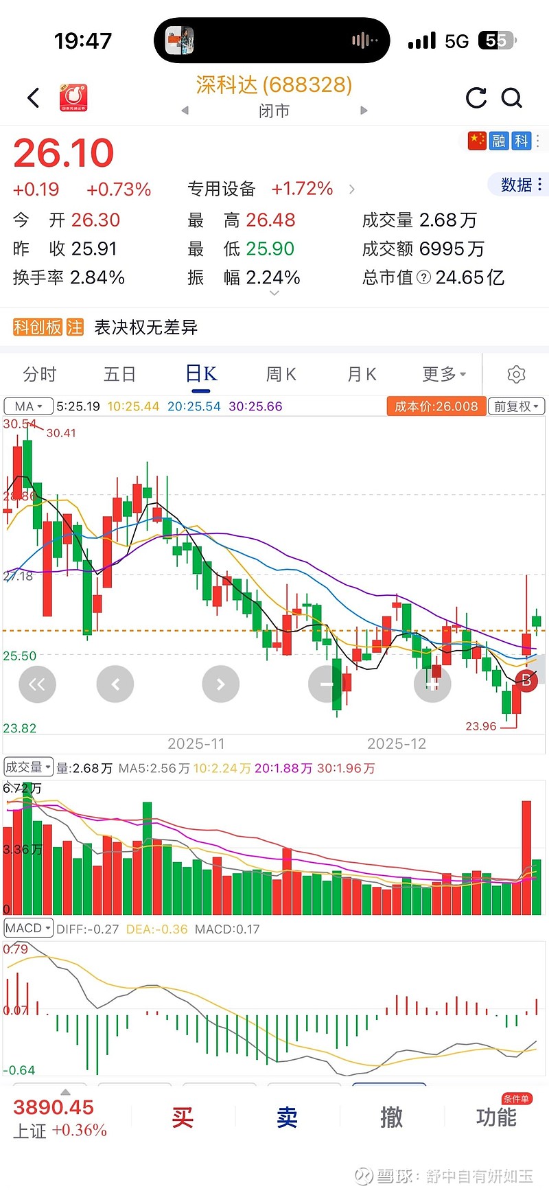 首次建仓:2025/12/18,26¥,+1000股,手动买入。建仓原因:18日现口袋支点的买点,公司三季报业绩大幅改善,营收增长30%,净利润扭亏为盈。(长存三厂遇到身穿深科达马甲的厂商,若成功打入长存供应链,后续业绩可期)