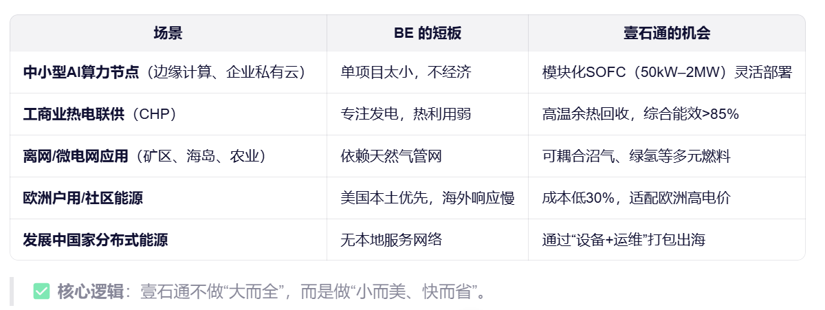 场景BE 的短板壹石通的机会中小型AI算力节点(边缘计算、企业私有云)单项目太小,不经济模块化SOFC(50kW–2MW)灵活部署工商业热电联供(CHP)专注发电,热利用弱高温余热回收,综合能效>85%离网/微电网应用(矿区、海岛、农业)依赖天然气管网可耦合沼气、绿氢等多元燃料欧洲户用/社区能源美国本土优先,海外响应慢成本低30%,适配欧洲高电价发展中国家分布式能源无本地服务网络通过“设备+运维”打包出海