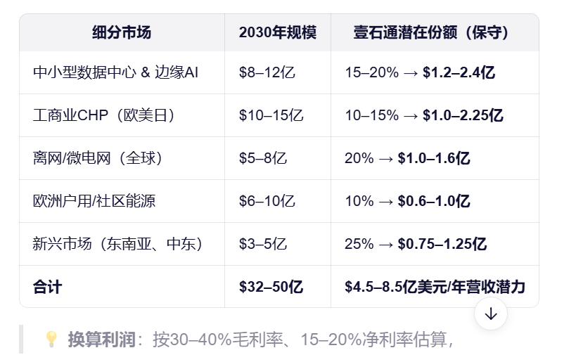 细分市场2030年规模壹石通潜在份额(保守)中小型数据中心 & 边缘AI$8–12亿15–20% → $1.2–2.4亿工商业CHP(欧美日)$10–15亿10–15% → $1.0–2.25亿离网/微电网(全球)$5–8亿20% → $1.0–1.6亿欧洲户用/社区能源$6–10亿10% → $0.6–1.0亿新兴市场(东南亚、中东)$3–5亿25% → $0.75–1.25亿合计$32–50亿$4.5–8.5亿美元/年营收潜力