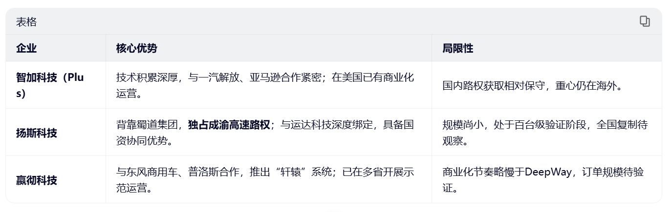 企业核心优势局限性智加科技(Plus)技术积累深厚,与一汽解放、亚马逊合作紧密;在美国已有商业化运营。国内路权获取相对保守,重心仍在海外。扬斯科技背靠蜀道集团,独占成渝高速路权;与运达科技深度绑定,具备国资协同优势。规模尚小,处于百台级验证阶段,全国复制待观察。嬴彻科技与东风商用车、普洛斯合作,推出“轩辕”系统;已在多省开展示范运营。商业化节奏略慢于DeepWay,订单规模待验证。