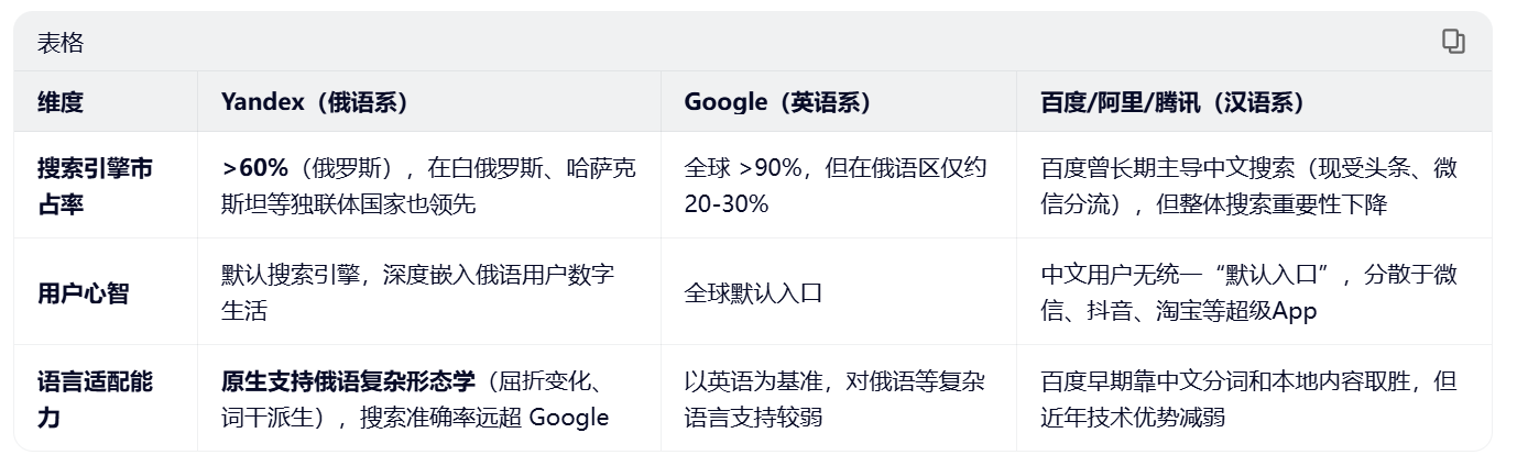 维度Yandex(俄语系)Google(英语系)百度/阿里/腾讯(汉语系)搜索引擎市占率>60%(俄罗斯),在白俄罗斯、哈萨克斯坦等独联体国家也领先全球 >90%,但在俄语区仅约 20-30%百度曾长期主导中文搜索(现受头条、微信分流),但整体搜索重要性下降用户心智默认搜索引擎,深度嵌入俄语用户数字生活全球默认入口中文用户无统一“默认入口”,分散于微信、抖音、淘宝等超级App语言适配能力原生支持俄语复杂形态学(屈折变化、词干派生),搜索准确率远超 Google以英语为基准,对俄语等复杂语言支持较弱百度早期靠中文分词和本地内容取胜,但近年技术优势减弱