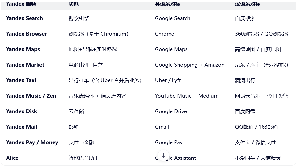 Yandex 服务功能英语系对标汉语系对标Yandex Search搜索引擎Google Search百度搜索Yandex Browser浏览器(基于 Chromium)Chrome360浏览器 / QQ浏览器Yandex Maps地图+导航+实时路况Google Maps高德地图 / 百度地图Yandex Market电商比价+自营Google Shopping + Amazon京东 / 淘宝(部分功能)Yandex Taxi出行打车(含 Uber 合并后业务)Uber / Lyft滴滴出行Yandex Music / Zen音乐流媒体 + 信息流内容YouTube Music + Medium网易云音乐 + 今日头条Yandex Disk云存储Google Drive百度网盘Yandex Mail邮箱GmailQQ邮箱 / 163邮箱Yandex Pay / Money支付与金融Google Pay支付宝 / 微信支付Alice智能语音助手Google Assistant小爱同学 / 天猫精灵