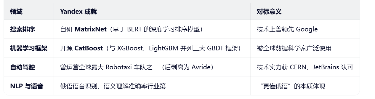 领域Yandex 成就对标意义搜索排序自研 MatrixNet(早于 BERT 的深度学习排序模型)技术上曾领先 Google机器学习框架开源 CatBoost(与 XGBoost、LightGBM 并列三大 GBDT 框架)被全球数据科学家广泛使用自动驾驶曾运营全球最大 Robotaxi 车队之一(后剥离为 Avride)技术实力获 CERN、JetBrains 认可NLP 与语音俄语语音识别、语义理解准确率行业第一“更懂俄语”的本质体现