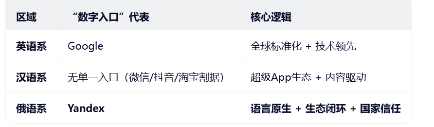 区域“数字入口”代表核心逻辑英语系Google全球标准化 + 技术领先汉语系无单一入口(微信/抖音/淘宝割据)超级App生态 + 内容驱动俄语系Yandex语言原生 + 生态闭环 + 国家信任