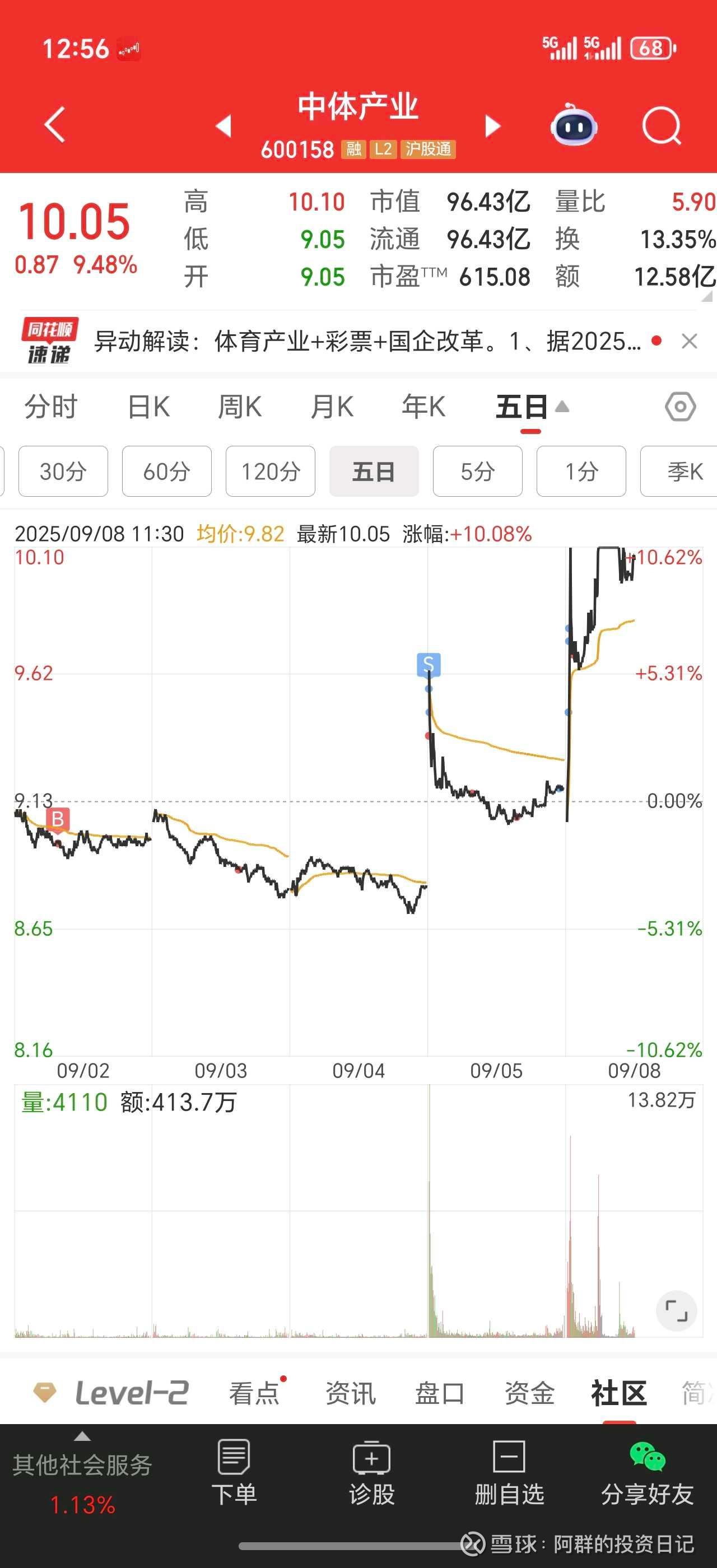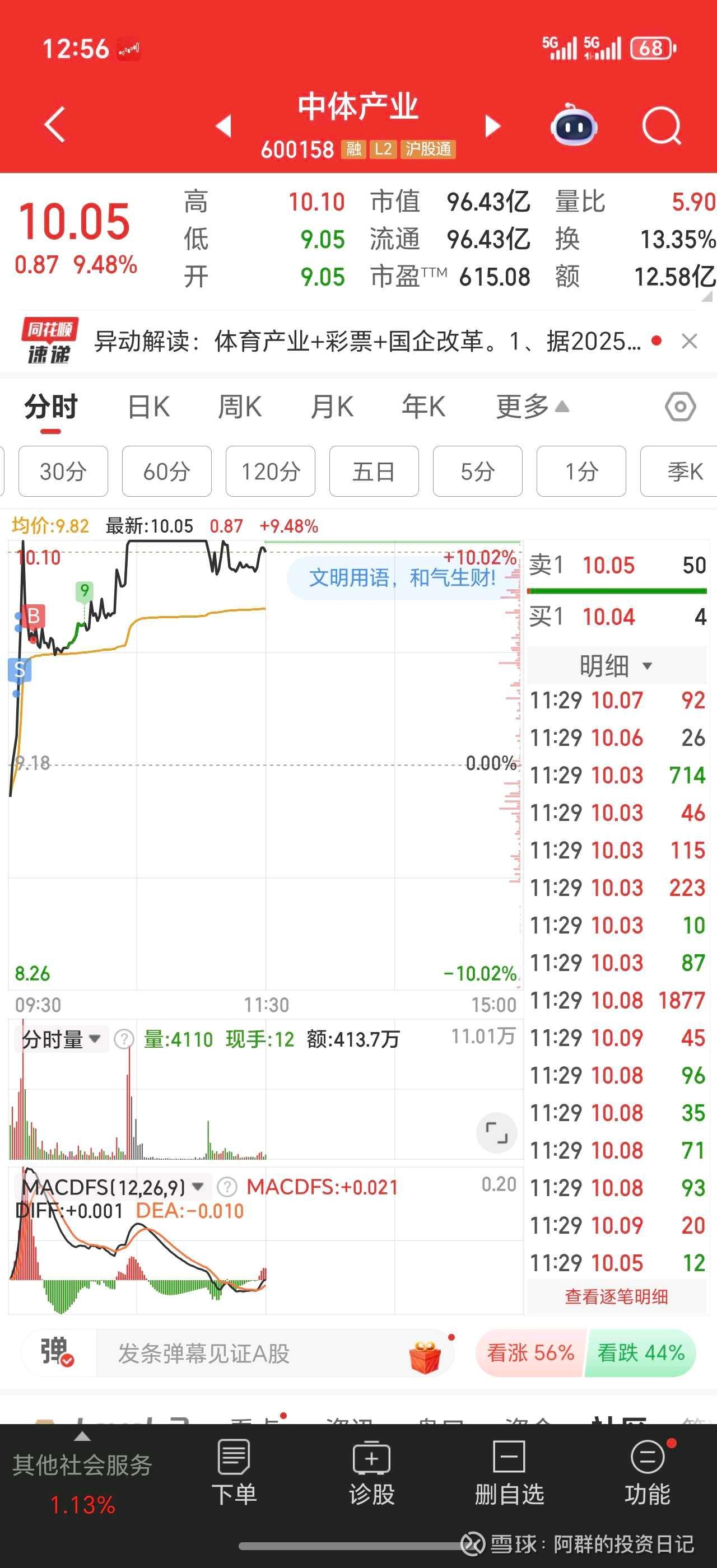 这几天做的最好的就是中体产业了,上周五高开卖了,盘中接回来,庄家洗盘太猛,便宜了我这个小韭菜!