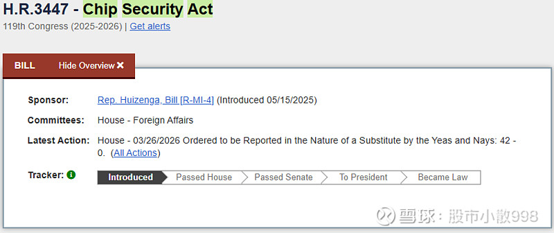 当地时间 2026 年 3 月 26 日,美国众议院外交事务委员会表决通过了《芯片安全法案》(Chip Security Act,H.R.3447),标志着美国对华技术遏制进入"技术追踪"新阶段。
