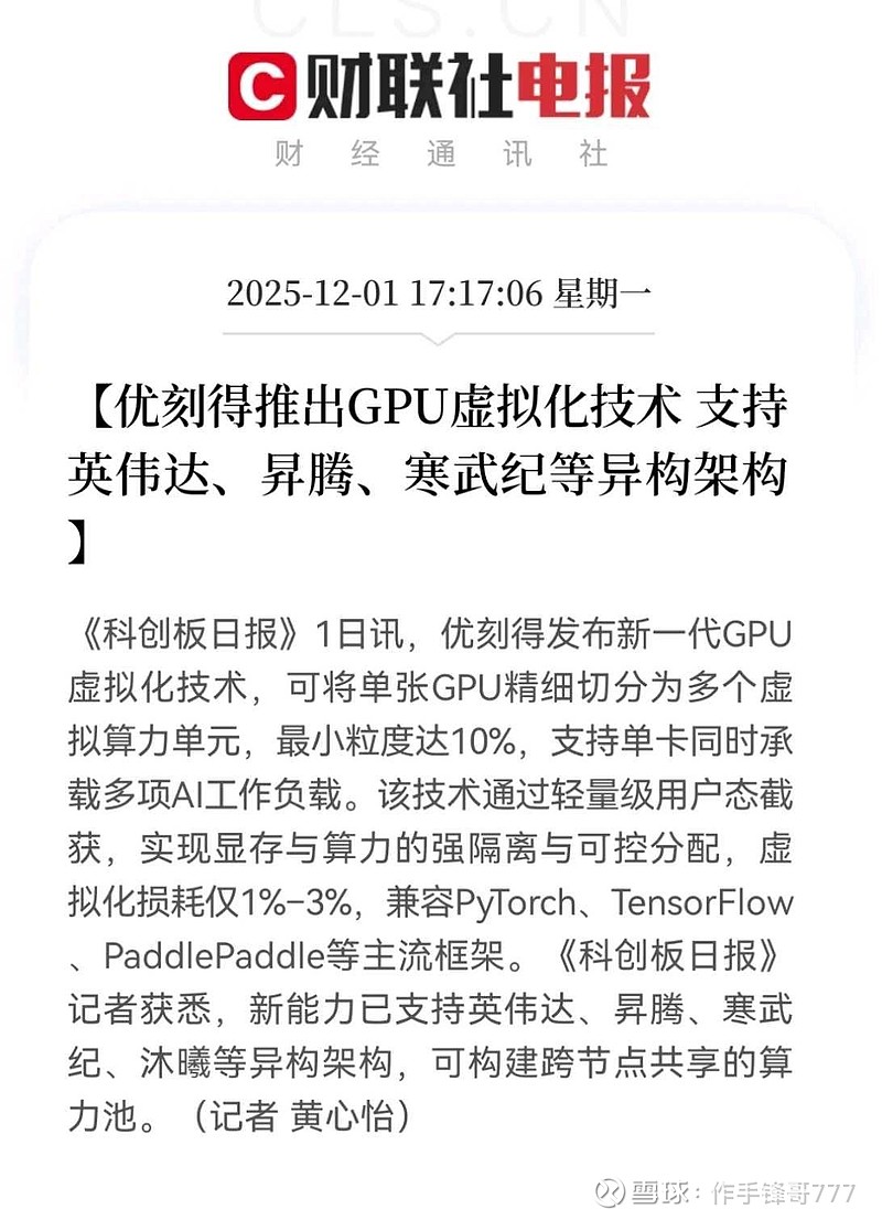 重大利好!这不是简单的技术迭代,是AI算力从“粗放供给”到“精准适配”的质变——未来,每一分算力都该被用到刀刃上。优刻得盘后传来重磅利好,优刻得推出GPU虚拟化技术 支持英伟达、昇腾、寒武纪等异构架构。企业将迎来新的投资风口。