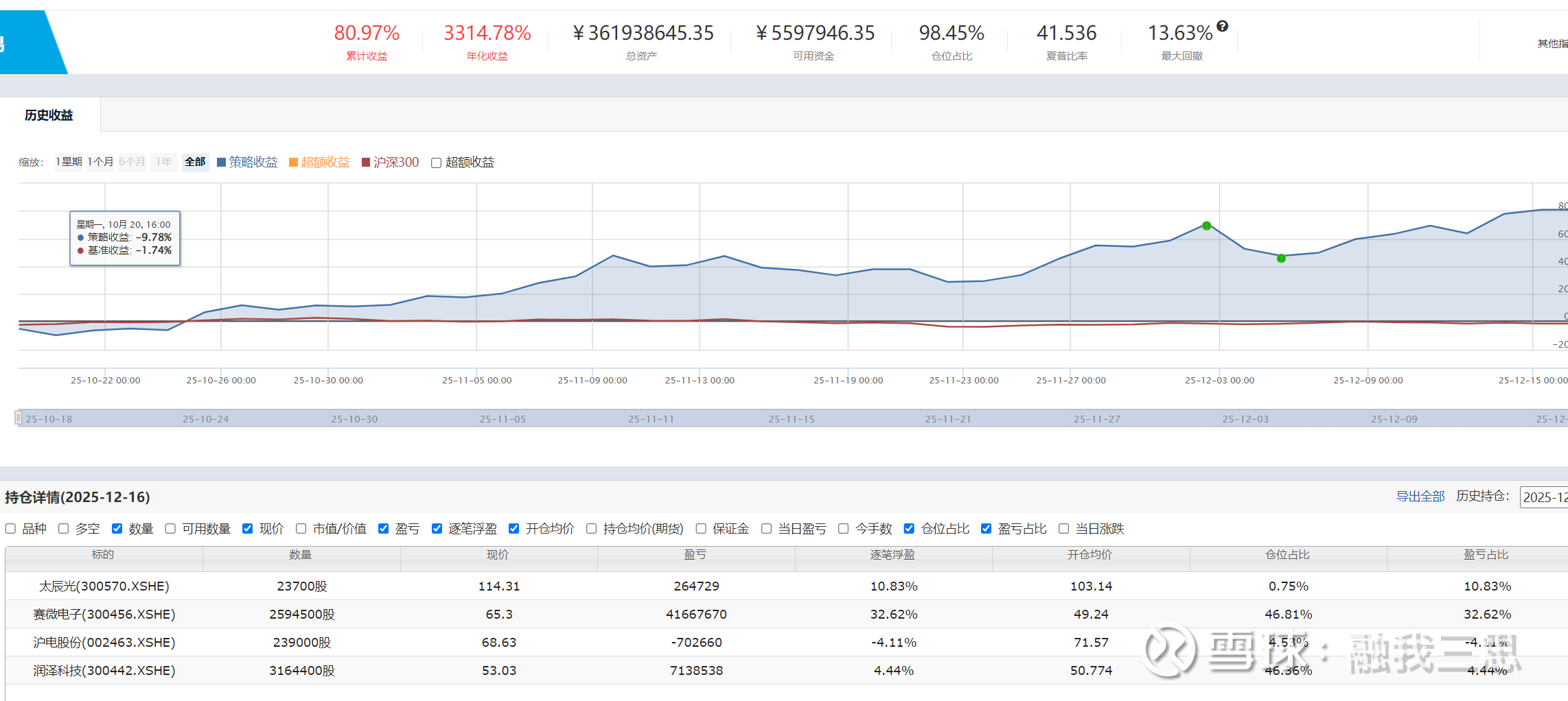 该量化策略是我从10月中旬开始运行的模拟盘,截至今日取得80点的收益,总结主要策略在2025年10月至12月期间,呈现清晰的两阶段重仓切换路径:前期(10月中至11月上)集中持有$香农芯创(SZ300475)$ ,捕捉其从约100元至近200元的主升浪;随后在11月中下旬将持仓重心切换至$赛微电子(SZ300456)$ ,并继续重仓持有至12月中旬,期间该股从约27元涨至65元以上。整体通过买入因子值打分高的股票(同时结合技术面进行确认),高度集中、持股待涨严格动态止盈止损的方式,把握了两轮明显的个股趋势行情。