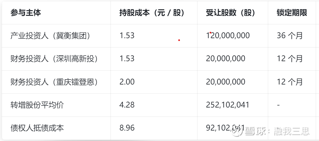 不同参与主体持股成本对比本次重整中,产业投资人、财务投资人、债权人的持股成本差异显著,形成了阶梯式的估值锚定体系,对二级市场投资具备极强的参考意义,具体如下表: