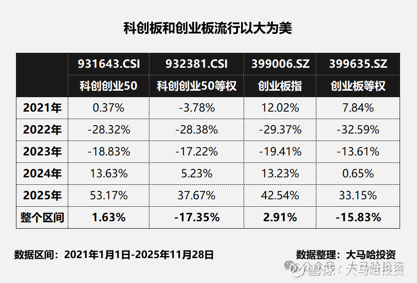 尽管2021年以来的过去几年时间里,全市场小盘股表现整体强于大盘,但在科创板和创业板中则是另一幅光景。下表列出了科创创业50及其等权指数和创业板指及其等权指数2021年以来的分年度及整个区间业绩表现,大家可以发现市值加权指数时要明显优于等权指数的。在2024年和2025年,市值加权指数的优势要更为明显。