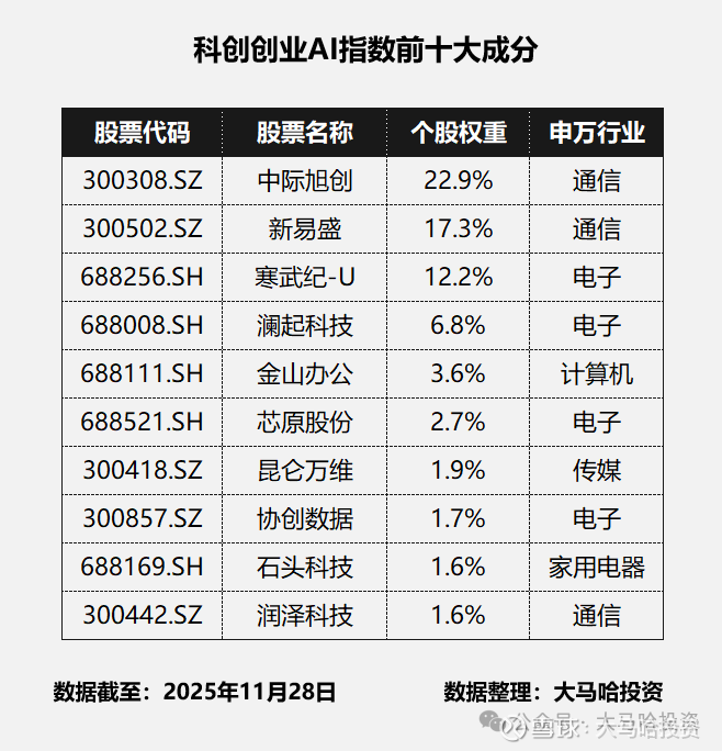 鉴于科创创业AI良好的业绩表现,很多人不自觉的关注该指数的权重成分股,下表为11月28日科创创业AI指数的前十大成分及权重。