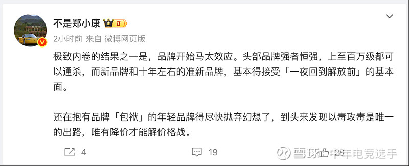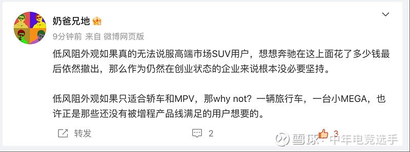 $理想汽车(LI)$ 在产品理念上有自己的长处,但是一直试图用做更好的产品对对抗更高维的品牌的的力量。现在结果看上去这行的品牌差异化足够大,产品差异化没那么大,试图一直通过产品创新来解决问题似乎是行不通的。当然作为一个新创品牌,要跟SPACEX已经成功的钢铁侠老马,和美国官方认证的华为比品牌打造,本身也是地狱难度,只是完全放弃品牌投入 还是觉得不是正确的选择。