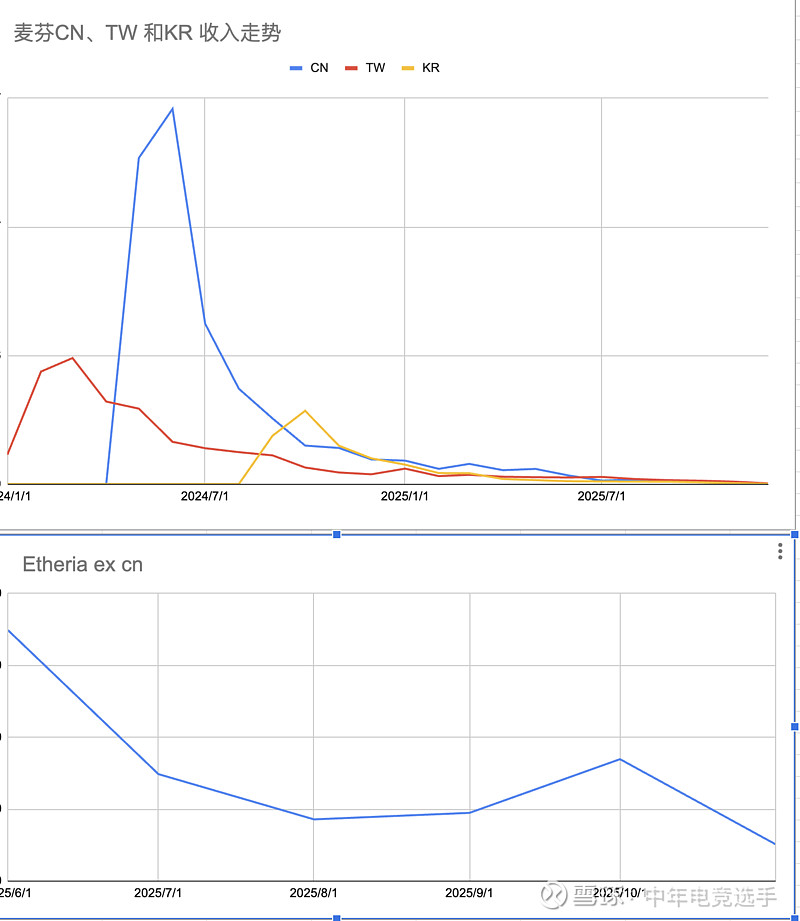 -麦芬在 25H1 的流水占比大约 40%,到了 H2 掉到大概 13%; (见下图,25H1 是 KR 服等服开服后的 phase2,收入相对比较高,现在全面下跌了 进入 phase3 了)