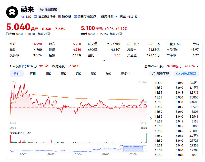 利好还没消化完,2月6日又赶上换电服务突破1亿次的里程碑,这记组合拳直接把市场打醒了:港股先涨6%,美股跟着飙超10%,一口气突破并站稳5美元压力位。