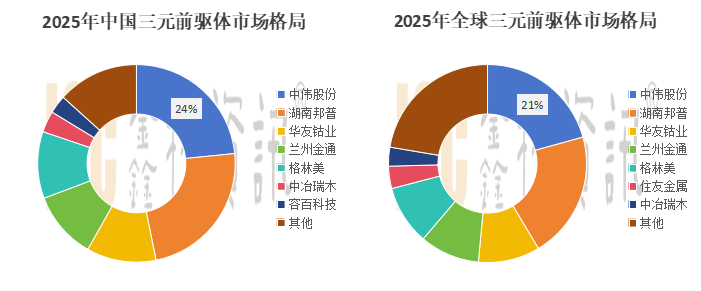 2025年的市场份额上,中伟新材(300919.SZ;02579.HK)凭借24%的国内市场占比、21%的全球市场占比,第六年蝉联榜首。除中伟新材外,湖南邦普、兰州金通受益于宁德时代供应链的订单需求,叠加产能爬坡,市场占比出现明显提升。