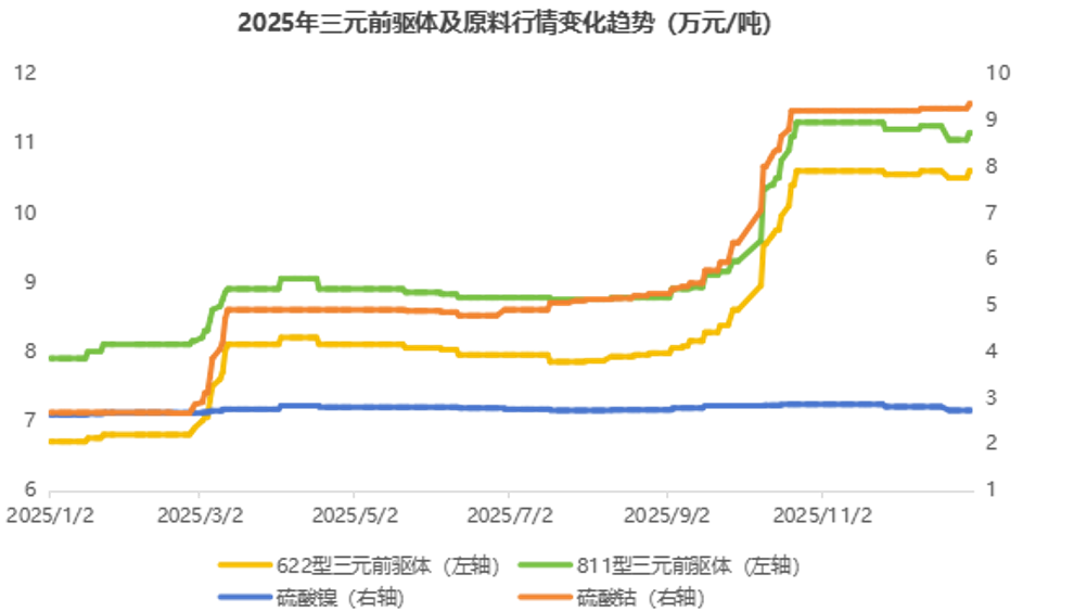 价格端的表现也与渗透率情况相适配,622型、811型三元前驱体在2025年内经历了3月、10月的两轮显著上涨。